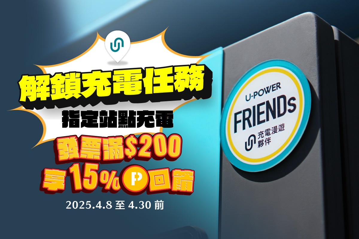 2025.4.30 前,不限時段,只要到 U-POWER FRIENDs 充電漫遊夥伴站點充電,單筆發票金額滿 200 元(含),即可獲得 15% U-POINT回饋💰